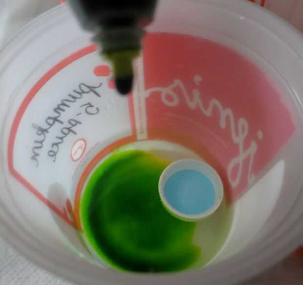 El fondo más oscuro 1/3 del huevo, que, una vez más, pone una tapa de plástico en la Copa, y utilizando un huevo para medir, llené cada taza con agua caliente de 6 cucharadas, sólo 1/2 cucharadita blanco vinagre y 9 gotas colores azul y rosa, 15 gotas cada colores verde y amarillo. Use una cuchara de plástico y mezcle bien.