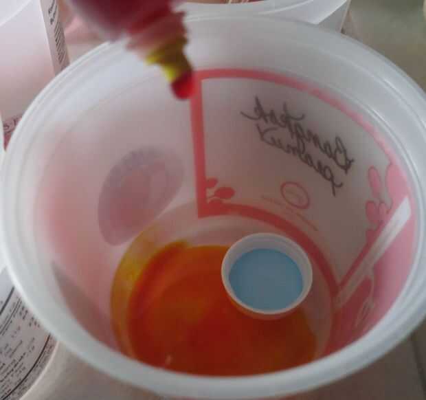 La segunda Copa celebró una tapa de plástico para mantener el agua caliente de huevo vertical, 10 cucharadas (ayuda si pones un huevo a medir, sentarse en la tapa de plástico y verter el agua para cubrir 2/3 del huevo, dejando 1/3 sin cubrir, dependiendo del tamaño de los huevos, la cantidad de agua puede diferir). Usé blanco 1 cucharadita de vinagre y colorante líquido más para obtener un tono más oscuro. El azul y el rosado utilizan 6 gotas cada una, las gotas verdes y amarillas, 12. Use una cuchara de plástico y mezcle bien.