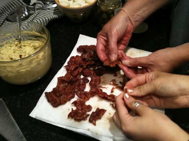Sacar cada onza de grasa de la panceta.  Es un proceso desperdiciador de tiempo, pero vale la pena.  Muchas manos hacen el trabajo ligero!
