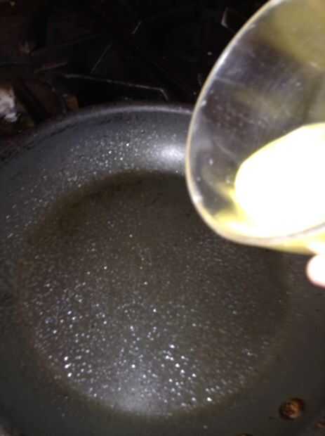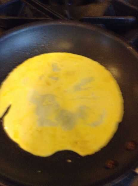 Mezclar todo y luego engrasar la sartén. Luego viértala en la sartén. Espere unos 10 segundos luego empuje el huevo a un lado