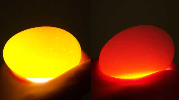 Para comprobar si el huevo es revuelto correctamente, vaya a un cuarto oscuro y brillar una linterna a través de su huevo. Un huevo asociado aparecerá brillante y amarillo, y se puede ver una sombra interior fundido por la yema (intacta). Bien revueltos será un color rojo mucho más oscuro, ya que la yema se mezcla ahora con la albúmina.