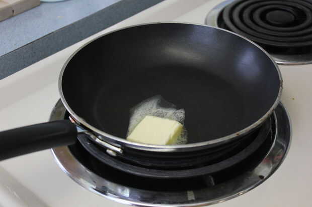 Añadir la mantequilla en un sartén caliente, una vez que comienza la fusión deslícelo alrededor de la bandeja.