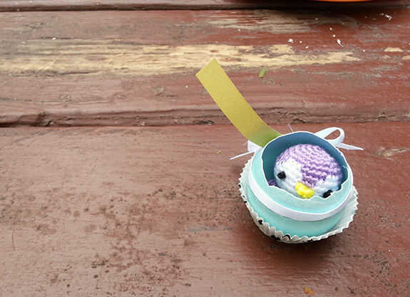 5.) utilizando una pistola de pegamento caliente, pegar la apertura de la base del huevo a un papel de cupcake mini y luego deje que se seque. Mantenga el huevo en posición invertida mientras esperas que el pegamento se seque.