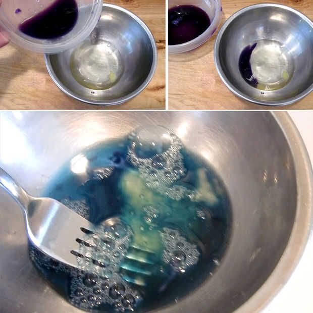 Para hacer tu propio verde huevos vierten una pequeña cantidad del jugo de col roja en su cuenco de huevo blanco y suavemente bate junto, debería ver un color cambiar casi de inmediato.