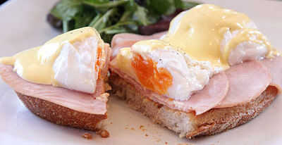 Coloque huevos sobre el jamón, superior con una rebanada de queso suizo, por lo que el calor de los huevos derrita el queso.