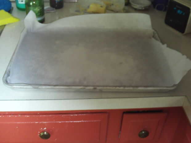 Primero deberás tomar el papel de pergamino y pone hacia fuera sobre la bandeja.