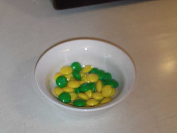 Abrir una bolsa de M y M y tipo el amarillo y verde M y M de otro colores de esa manera puedes Regular huevos y tocino o verde huevos y jamón.