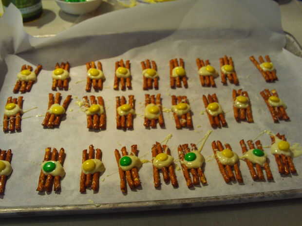 El último paso es añadir todos los ingredientes juntos, tomar una cuchara normal y poner sobre una cucharada de blanco de chocolate sobre cada 3 rosquillas. Tómate tu tiempo porque el chocolate blanco llevará un rato para refrescarse. Luego poner el color amarillo o verde M y de M o ambos sobre el chocolate blanco. Después de esto deberás esperar un tiempo, si quieren para refrescarse más rápido y estable que ponga el caramelo (si está activado un pan) en el congelador durante unos 10 minutos y sacarlos.