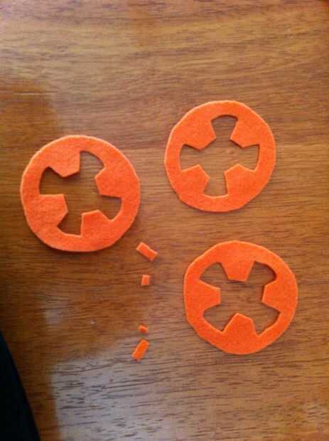 Cortar cuatro círculos, un gran ojo, un ojo pequeño, gris tres tiras y cuatro cuadraditos de naranja. ----------------------------------------------- Antena