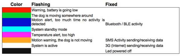 Debido su uso es casi obvio que este dispositivo no requiere una interfaz de usuario completa para trabajar. Pero por otro lado es muy útil la capacidad de conocer la situación de Hugo con sólo una mirada. La opción fue adoptar un único RGB led para gestionar todas las señales esenciales que tiene sentido ser notificado visualmente. La tabla explica el código de colores adoptado y la duración de luz para cada estado considerado.