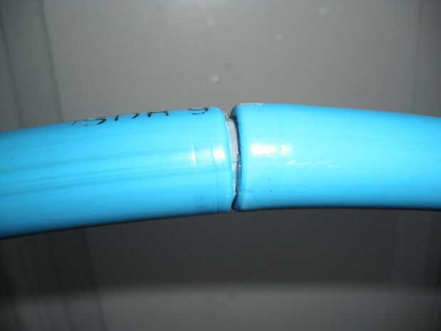 Usted puede encontrar que una vez el segundo extremo del tubo en el conector, es es bastante difícil conseguir que se mueva a lo largo de manera que unen los extremos. Para conseguir a Mantenga el aro verticalmente con la unión entre la izquierda y la mano derecha y la parte inferior del aro en el suelo, luego empuje la articulación hacia arriba y hacia abajo. Esto parece algo extraño y su muy lento y duro trabajo, pero os garantizo que los extremos de la tubería se mueven lentamente hacia los demás. La otra cosa que puedes hacer es envolver alguna cinta (la más arrugada la mejor) alrededor del aro a ambos lados de la Unión para dar un mejor agarre cuando Junte los extremos.
