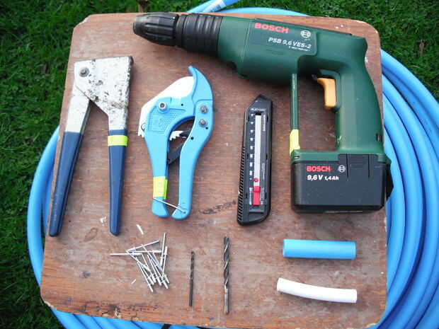 - tubería - usar tubería MDPE que este tubo azul viene en diámetros de 25 mm y 20 mm. Usted puede conseguir de bricolaje tiendas B & Q Wickes o Screwfix. La última vez que compré algunos, el lugar más barato fue Toolstation por desgracia la longitud más pequeña que viene en parece ser 25 metros.