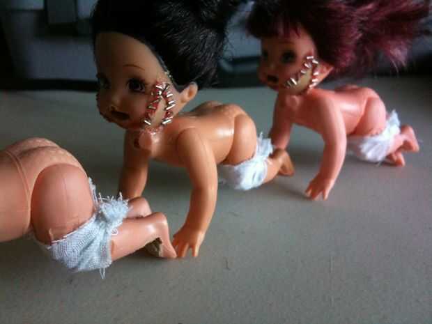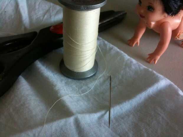 Doble a la tela alrededor de la rodilla y mano coser a, nudos, hilos y la tela sobrante del corte. Repita para todas las muñecas.