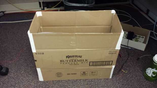 Encontrar una caja que se adapta a la forma general del cuerpo. La caja no necesita ser enorme ya que los botones no terminan siendo muy grande. Tenemos esta caja de Walmart cuando ellos fueron de reposición cereales. Si usted puede encontrar un cuadro que ya es un color deseado como blanco, se podría ahorrar un montón de pintura. Hemos grabado las aletas para hacer más alto también.