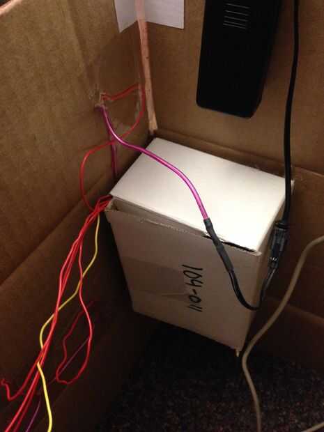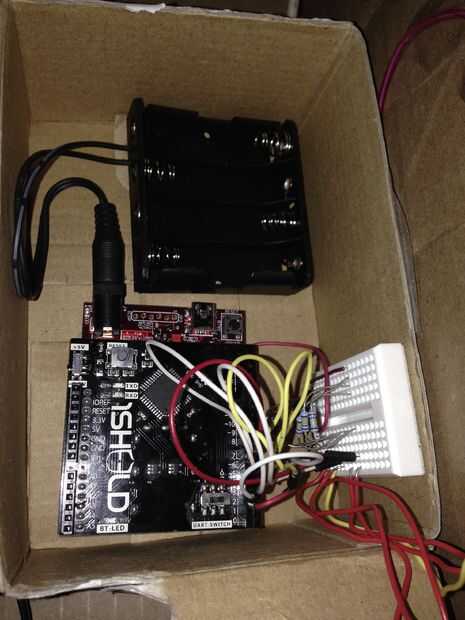 En este punto usted tiene cables por todas partes, así saber donde quiere ir y con cinta adhesiva hacia abajo. También encontramos una pequeña caja y utiliza Velcro para fijarla en el interior esquina. Luego coloca la batería, protoboard y uC32/1sheeld allí y había asegurado con Velcro así.