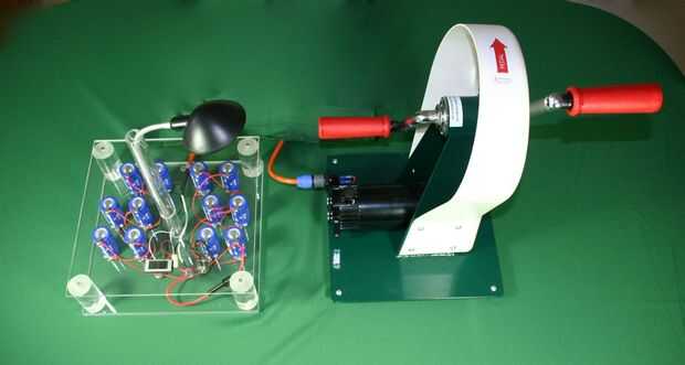Este proyecto toma la actividad humana (un generador de manivela de la bobina) y almacena la energía en una forma futurista (ultracapacitores) una luz LED muy eficiente de la energía. El generador es costoso, tal vez su escuela puede comprar uno para el laboratorio de Ciencias.