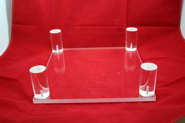 Inicio colocando cuatro barras de 2 pulgadas de largo (1 1/2 pulgada de diámetro) a la 12 pulgadas cuadradas, 1/2 pulgada hoja de acrílico gruesa. Taladre agujeros en la base y las barras, pero primera práctica usando una pieza de madera de desecho. Encontrar un tamaño de orificio que sólo permiten un tornillo de tamaño mediano se deslice hacia adentro y hacia afuera, luego reducir ese diámetro por 1/16 de pulgada. Si los orificios son muy pequeños, el acrílico se agrietará cuando se agregan los tornillos. Fije la base a las barras mediante la inserción de tornillos en los orificios.