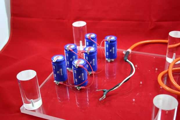 Conecte cinco ultracapacitores más a la base. Perfore un agujero de 7/64 inch en la base inferior en cada ubicación del condensador. Usando un 3/8 pulgadas de largo por 1/8 pulgada diámetro tornillo metal, inserte el tornillo a través de la lengüeta de montaje de los ultracondensadores. Como montar cada ultracondensadores, conecte un cable desde la parte superior (positivo) de cada condensador en la parte inferior (negativa) del condensador siguiente.