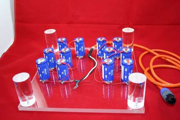 Fijar seis ultracapacitores más a la derecha de la base.  Otra vez, conecte positivo en cada uno de estos condensadores a la negativa en el condensador próximo de la serie.