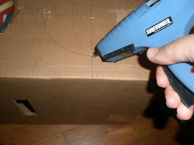 Para cada poste colocamos pequeños toques de pegamento caliente en los cuatro lados de uno de los círculos habíamos dibujado y luego se coloca una de las cajas redondas, de arriba abajo, sobre el pegamento caliente. Hicimos ajustes según sea necesario antes de que el pegamento endurece. Una vez endurecido lo corrimos pegamento caliente alrededor de la viga donde tocó la caja de cartón. Fuimos muy generosos con el pegamento caliente, permitiendo que algunos de los que "inyectar" debajo de la viga para obtener un buen sello.
