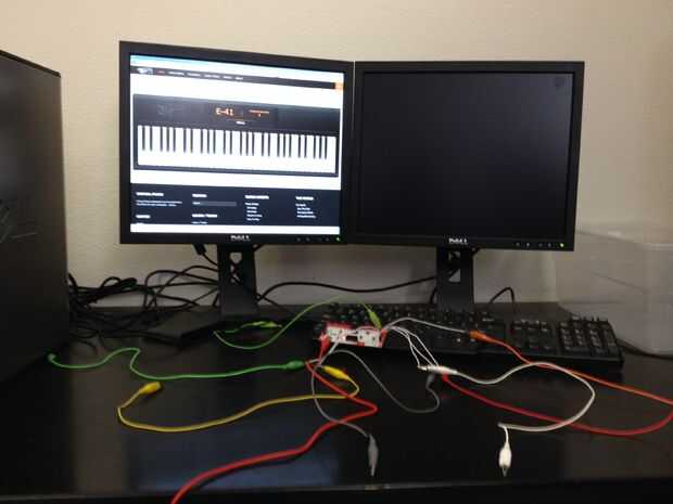 Durante la noche construir MaKey MaKey en Boise del estado biblioteca de la Universidad de Albertsons, asistente y estudiante, Scott Schmader, aprendieron cero para desarrollar este increíble piano. Utilice el manos libres MaKey MaKey tierra pulsera
