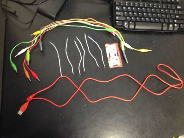 El makey makey es un circuito que conecte a un ordenador, mientras que el otro lado tiene una diferente cantidad de cables de conexión. Cualquier elemento que conduce la electricidad se puede utilizar con el makey makey para crear un controlador para
