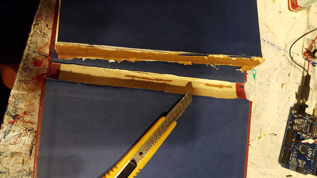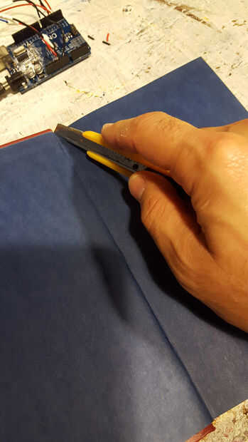 Usando el cortador, el contenido de libro de cubierta de libro. Luego use la uña para hacer 3 agujeros para los leds y un agujero rectangular para el interruptor.
