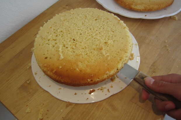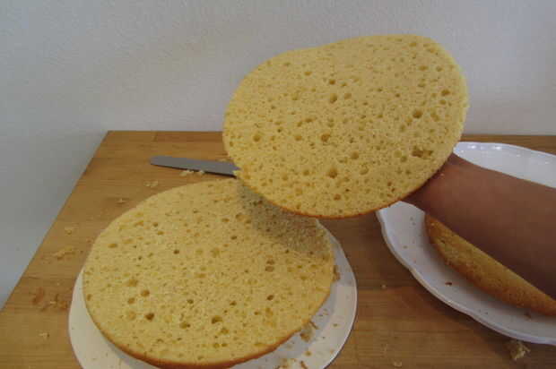 Cuando se hacen para hornear un refrescado apagado, coloque la sección más delgada de torta boca abajo en una fuente de servir. Tome el más grueso y cortar longitudinalmente por la mitad. Tendrás dos sección delgada perfecta de la torta para una capa adicional.