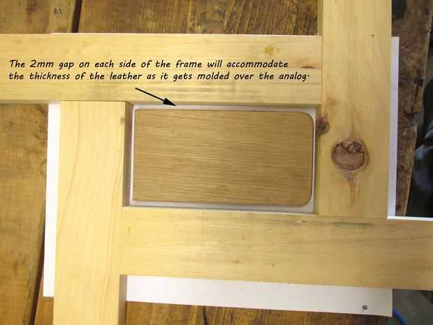 Con el teléfono analógico terminado, el siguiente paso es hacer un marco de madera que se utilizará para forzar la piel sobre y alrededor de la analógica formando la forma de la caja. Este marco será ligeramente más grande en anchura y altura para acomodar el espesor de la piel que moldea alrededor de la analógica. El cuero de 6 onzas que utilicé fue aproximadamente de 2mm de espesor así que añadido 2mm para las dimensiones de mi medición analógica de teléfono para determinar el interior superior e inferior y lado dimensiones de la estructura.