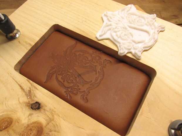 PRO TIP: en lugar de utilizar el método tradicional de estampación con una herramienta y un martillo he optado usar presión de sujeción para un sello más grande de la fuerza hacia abajo en la superficie blanda de la piel. Esta técnica produce excelentes resultados y permite añadir decoración realmente complicada para su trabajo con un mínimo de esfuerzo. Además, si usted tiene acceso a una impresora 3D usted puede diseño personalizado tus propios sellos para personalizar realmente su trabajo. Echale mi Instructable sobre la creación de sellos de cuero 3D personalizado para obtener más información de este proceso.