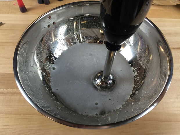 Use una batidora de mano para mezclar alginato de sodio y agua en un tazón grande. Se agrupan, así que asegúrese de que se mezcla completamente. Deje la solución reposar durante al menos 24 horas. La solución debe ser clara y libre de burbujas antes de pasar al siguiente paso.