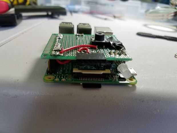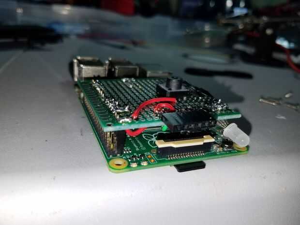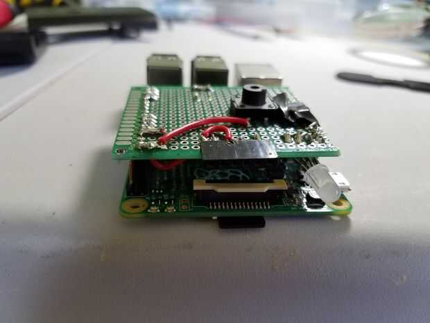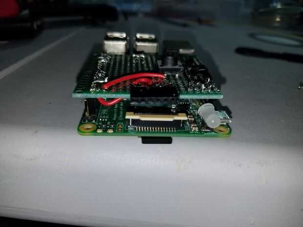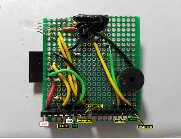 He creado este foro principalmente para comodidad y no hay que nada realmente complicado sucede aquí. Debido a requisitos de tamaño, sólo estamos utilizando los pernos en los 3.3v del pinout de la Raspberry Pi. Eso es sólo los encabezados de 2x8pin (que debían para ser apilable, pero no se ajustan al lado del otro, así que tenemos que saltar un alfiler) y se puede ver que corte la tabla corta en la fila para la letra T colocarlo horizontalmente en el caso. En el otro lado, la cinta aislante está cubriendo otra jefe del pin que talan de altura que descansa en el puerto HDMI en el Pi. Sin esto, la Junta sólo flota gratis y a veces se dobla hacia abajo y hace contacto con los puntos en el Pi, que como puede haber adivinado, es muy malo para el Pi. Pienso montar una cabecera de 6 pines para el sensor DHT, y el sensor abierto/cerrado con las patas dobladas 90 grados para enfrentar lo que se convierte en el frente de nuestra configuración (hacia el lado en blanco, no los puertos USB) y el botón momentáneo en la parte superior de la Junta y un LED RGB para la salida, también frente a frente junto al jefe del pin de la y el zumbador en la parte inferior del tablero. Tendrás que jugar con la colocación de la alarma que probablemente no quieras descansando en el chip. Como he mencionado anteriormente, usando solamente este lado de los pines, no tienes una línea de 5v, pero usted puede encontrar una manera de conectar en él, y poner un transistor entre él y el GPIO para el timbre, como que zumbador es un zumbador de 5v y de 3,3 voltios no es fuerte en todos.