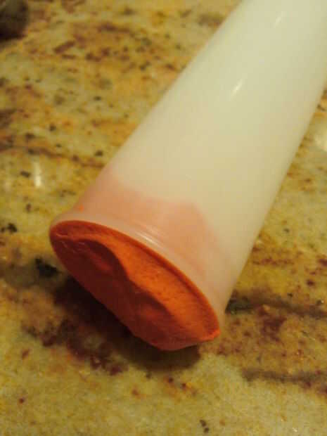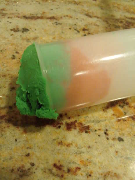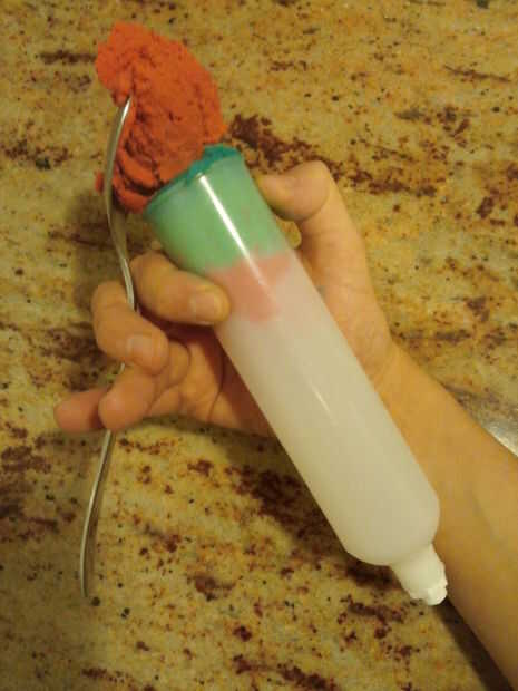 Ahora es cuando empieza la diversión. Tomar una cuchara de mesa completa de cada color y spooooon en el cartucho. Un color a la vez, presione firmemente con la cuchara, hasta que terminas con un efecto de arco iris. Evitar bolsas de aire (Recuerde bolsas de aire son nuestros enemigos).