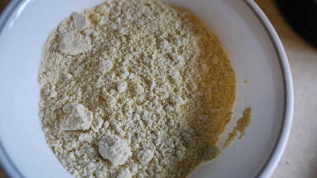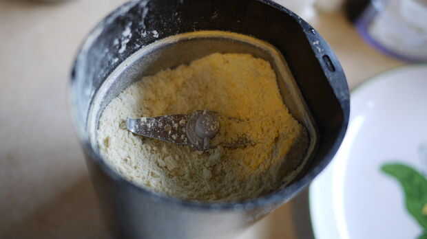 Añadir los garbanzos a la amoladora de 1/3 a la vez. Pulso durante 1-2 segundos hasta que haga un polvo muy fino. No sobre-rev su amoladora. Podría sobrecalentar.