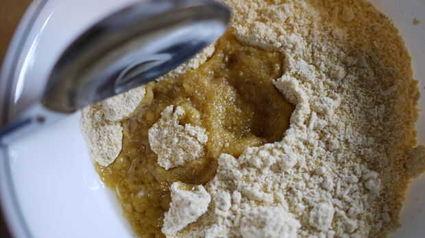 Agregar 1 cda de aceite de oliva para el polvo. Añadir 4 cucharadas de agua y agitar bien para obtener una pasta espesa de uniforme. Deje la pasta para absorber el agua mientras te pique el ajo.