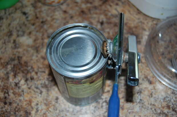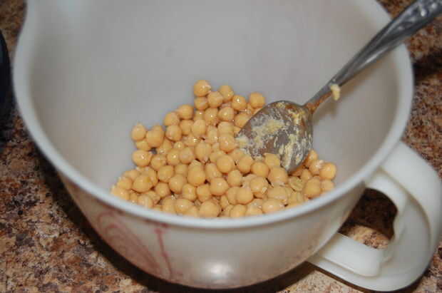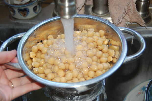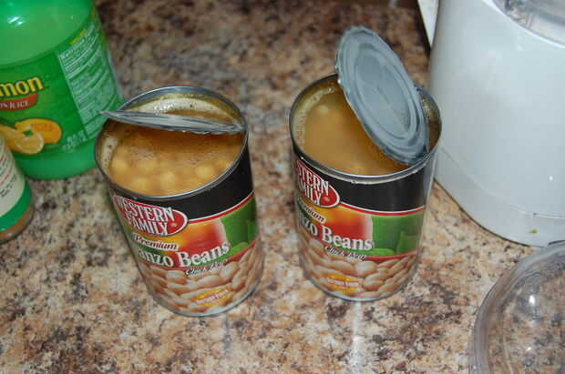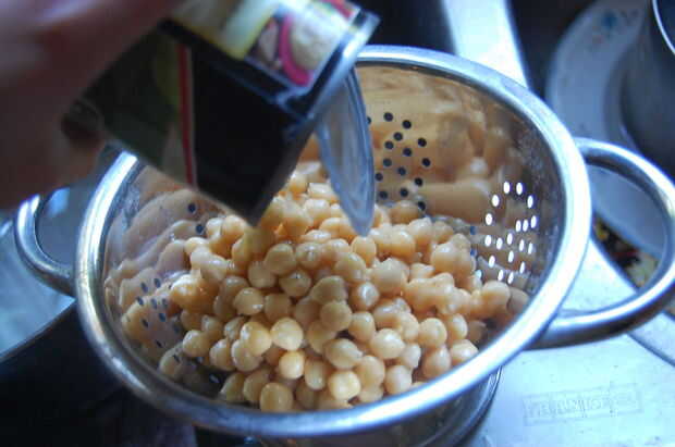 Toman las latas de garbanzos guisantes/garbanzos, abierto hacia arriba y lo pobre en un colador. Les dan un buen enjuague para bajar la salmuera y luego colocar en un bol.