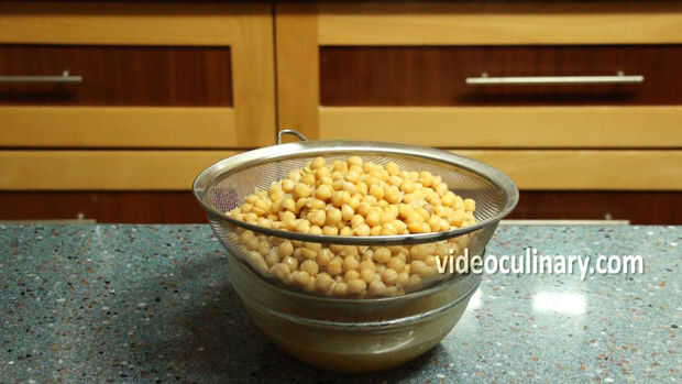 Cubrir con una tapa, llevar a hervir y cocinar a fuego bajo por 2.5-3 horas, hasta que muy suave. Colar los garbanzos y guardar el líquido de cocción.