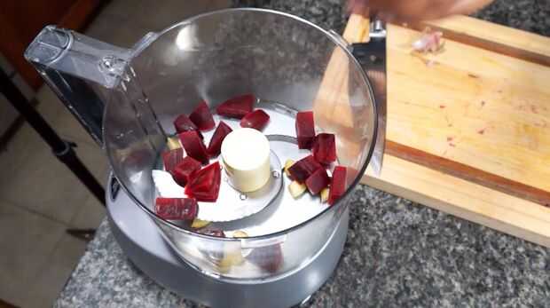 Proceso remolacha y el ajo en un procesador de alimentos hasta bellas.