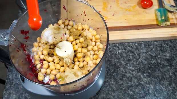 Añadir los garbanzos y todos los ingredientes restantes, incluyendo 1/4 taza del jugo de remolacha guardados. Proceso durante 2 minutos o hasta que se alcance una consistencia cremosa suave.