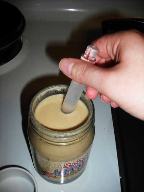 Tahini se comporta mucho como mantequilla de maní natural. Si tienes una lata nueva de este material, necesita asegurarse de que el aceite es mezclado en la pasta real, o tendrá un bloque muy duro de pasta de semillas de sésamo secas en la parte inferior y aceite de sésamo en la parte superior.