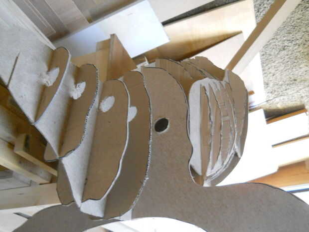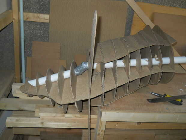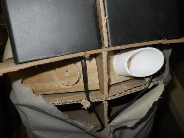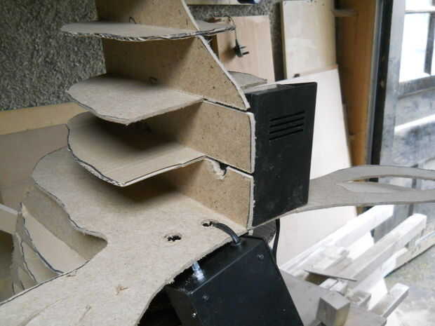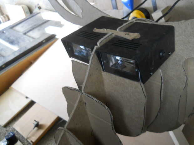 También monta las luces estroboscópicas en este punto, les enmascarar con cinta aislante para que las caras no consigue arruinar por fibra de vidrio. Los cables se funcionan a lo largo de la columna vertebral y apareció el mismo agujero como la pipa de humo.