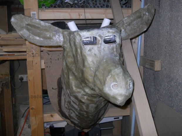 Perfore los orificios para los ojos con mi pequeña herramienta dremel y en la nariz con un forstner bit (utilizando protección ocular y mascarilla).