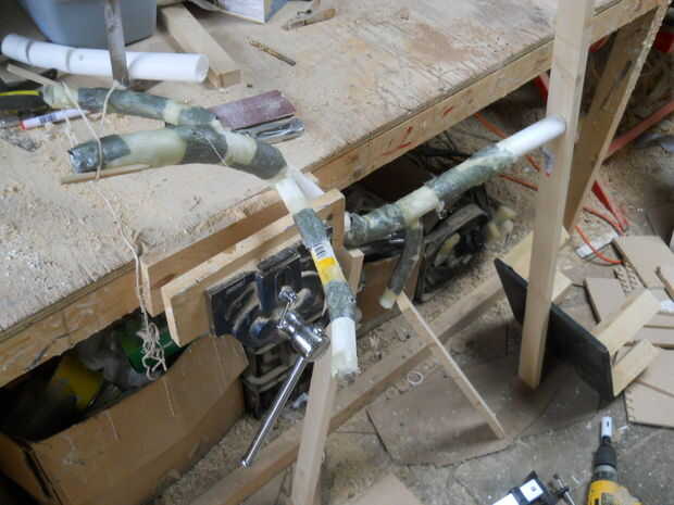 Tienen fibra de cristal demasiado pero fue un poco mal. La cinta absorbe la resina y pierde adherencia y la cornamenta comenzó a derrumbarse! Algún chapucero frenética de soportes y que se inclina contra él se parecía hacer el truco, pero esto significaba era maldita cerca de imposible conseguir los cuernos a coincidir muy bien... boo!