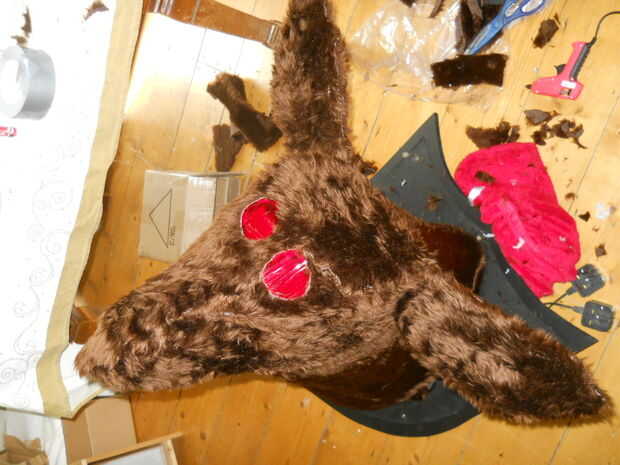 Luego gradualmente até la piel con una pistola de pegamento caliente, corte a la forma como trabajaba. Hice el cuello en una sola pieza, las orejas como otros 2, entonces la cabeza y lo que quedaba de otra.