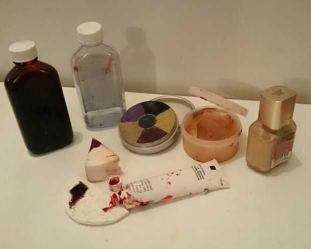 -Contusión colores, crema make up (puedes sustituir la sombra pero recuerda que la mayoría de sombras de ojos tiene un tinte metálico que les y disminuye el aspecto realista) - tengo productos de Ben Nye y Kryolan y son AWESOME!