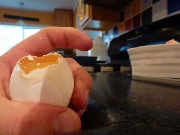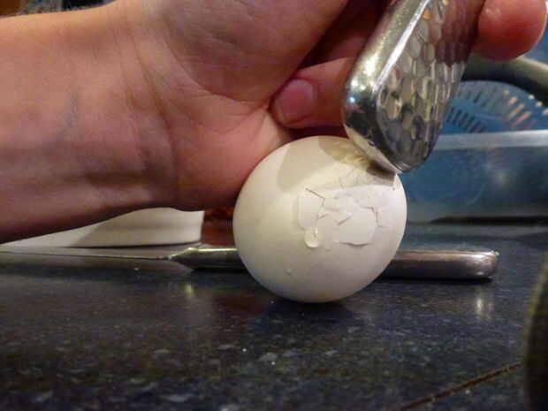 Ahora que tienes tus fuentes, estás listo para comenzar. En primer lugar, usando el mango del cuchillo de mantequilla, romper cuidadosamente la parte superior del huevo. Intentar hacer un pequeño círculo de grietas. A continuación, tirar y pelar la cáscara de huevo rota del huevo, manteniendo los bordes lo más recto posible. Deberás acabar con unos un orificio de 1" en la parte superior de su huevo.