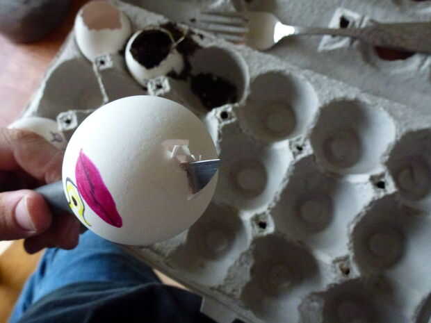 a continuación, necesitará hacer un orificio de drenaje en la parte inferior de Humpty. Usando su cuchillo, un agujero en la parte inferior del huevo. Si la cáscara del huevo, grietas pero no sale, eso está muy bien, siempre y cuando el agua puede salir a través de las grietas.