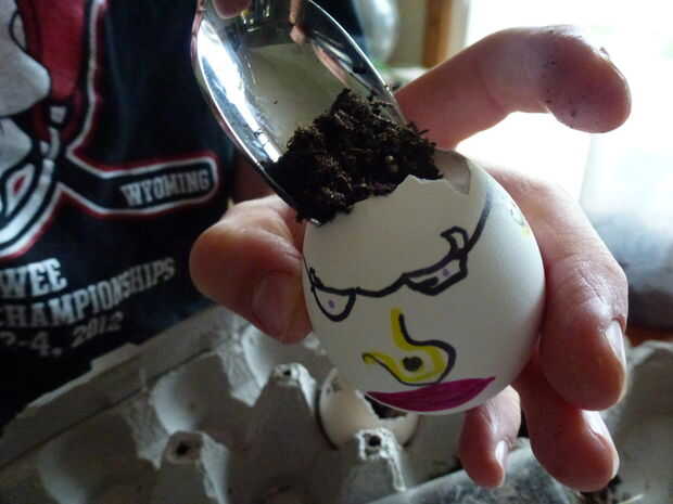 Por último, es hora de darle a Humpty algún pelo. Llene la cáscara del huevo con macetas, dejando 1/4" de espacio entre él y la parte superior. Espolvorear semillas de césped sobre la tierra, teniendo en cuenta que más semilla tiene más pelo. Cubra la semilla con algunas macetas adicional y empaque ligeramente. La semilla del agua y permitir que drene.