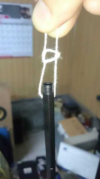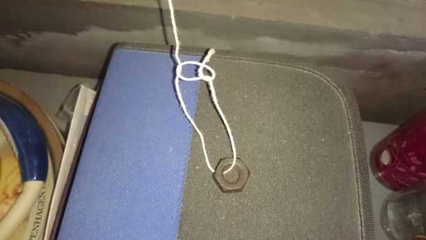 Poner una cadena a través de ambos anillos. La longitud depende de su necesidad. Bueno, hago una pluma flotando. Atar un extremo de la cuerda sobre el escritorio a un lápiz. Puede amarrar su clip o perfore un orificio si es necesario. Mi bolígrafo estándar ya tiene agujeros a través de ella justo antes de su casquillo de la cola. Ate el otro extremo cerca de la pared a una tuerca (del perno) con peso adecuado a la pluma. Yo no soy bueno en nudos y su nombre, pero me gusta utilizar este bucle de corriente simple. Creo que se llama "Nudo de la soga".