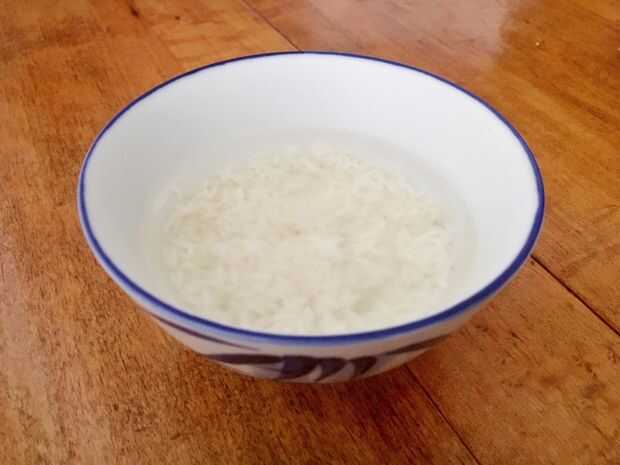 Cubrir el arroz en agua y se deja reposar durante la noche. Alternativa: Remoje el arroz en agua hirviendo durante 1-3 horas. Drenar el agua y proceder al siguiente paso.